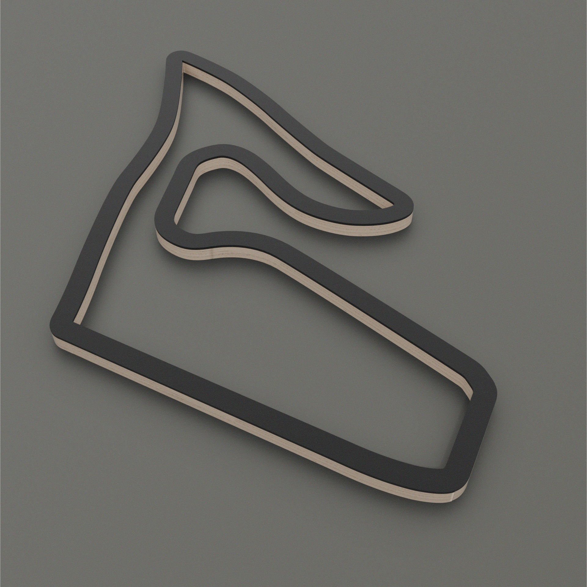 Crafted from high-quality multiplex birch wood, the piece reveals subtle layers and edges that add depth without visual noise. A matte black acrylic glass layer floats above the wood, creating a refined contrast and emphasizing the track’s silhouette with quiet confidence. The result is a sculpture that doesn’t shout motorsport — it embodies it. Minimal, balanced, and powerful.