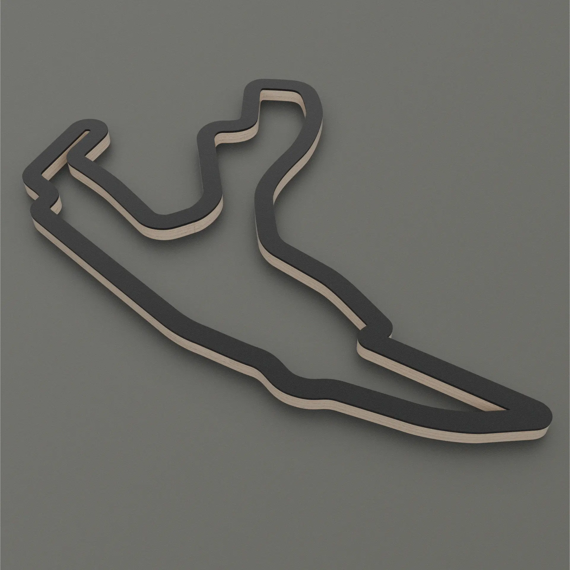 Crafted from high-quality multiplex birch wood, the piece reveals subtle layers and edges that add depth without visual noise. A matte black acrylic glass layer floats above the wood, creating a refined contrast and emphasizing the track’s silhouette with quiet confidence. The result is a sculpture that doesn’t shout motorsport — it embodies it. Minimal, balanced, and powerful.