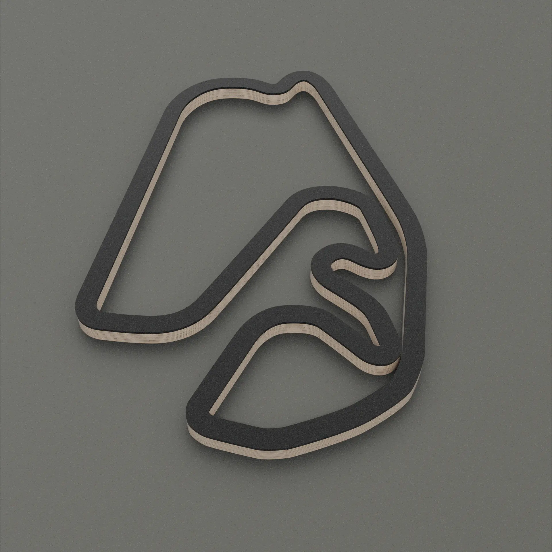 Crafted from high-quality multiplex birch wood, the piece reveals subtle layers and edges that add depth without visual noise. A matte black acrylic glass layer floats above the wood, creating a refined contrast and emphasizing the track’s silhouette with quiet confidence. The result is a sculpture that doesn’t shout motorsport — it embodies it. Minimal, balanced, and powerful.