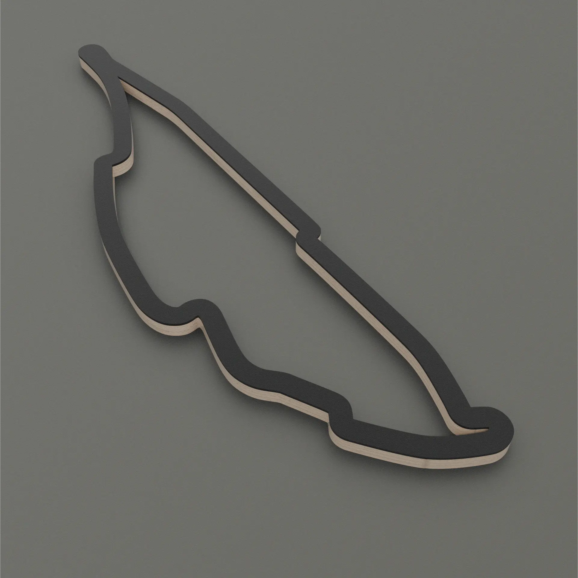 Crafted from high-quality multiplex birch wood, the piece reveals subtle layers and edges that add depth without visual noise. A matte black acrylic glass layer floats above the wood, creating a refined contrast and emphasizing the track’s silhouette with quiet confidence. The result is a sculpture that doesn’t shout motorsport — it embodies it. Minimal, balanced, and powerful.
