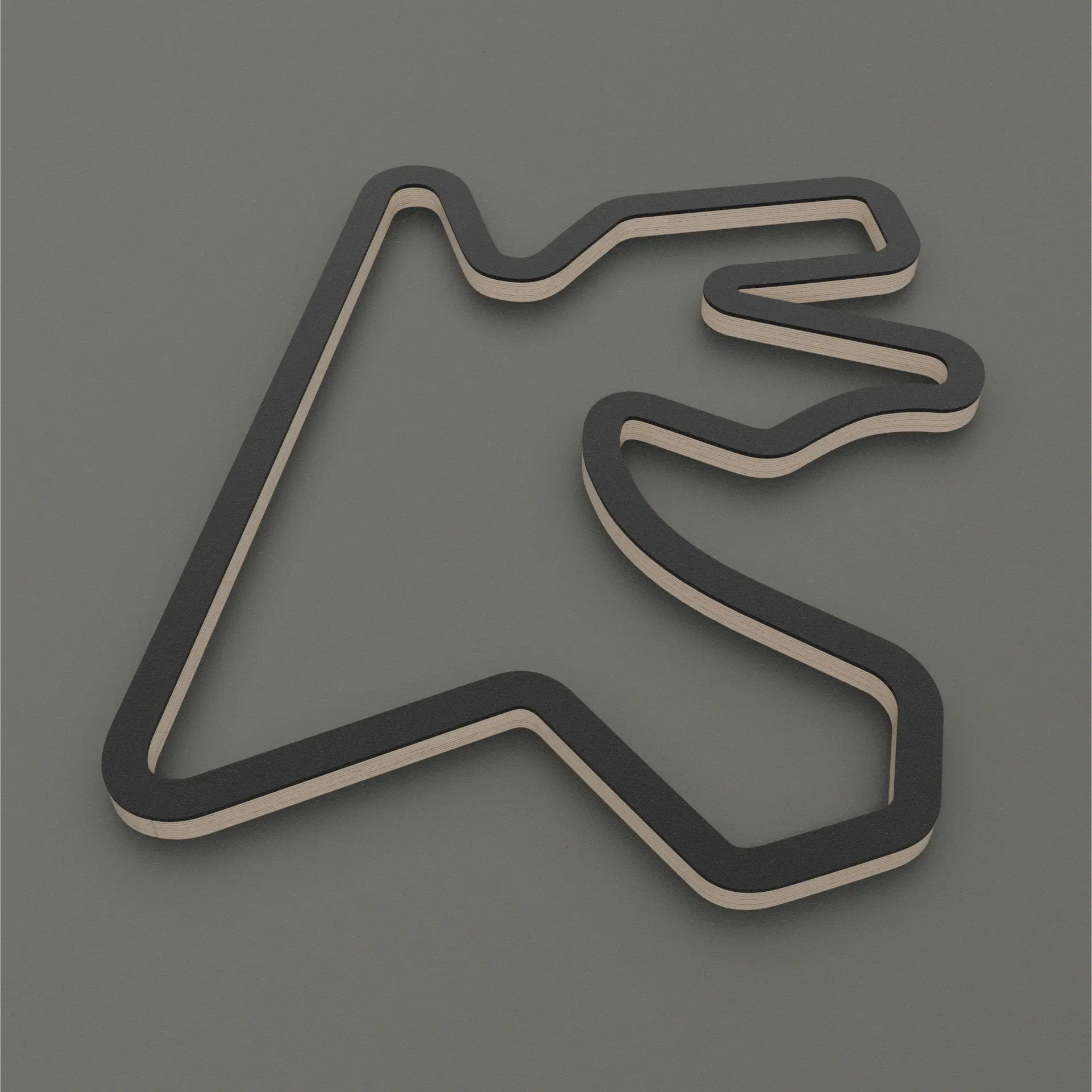Crafted from high-quality multiplex birch wood, the piece reveals subtle layers and edges that add depth without visual noise. A matte black acrylic glass layer floats above the wood, creating a refined contrast and emphasizing the track’s silhouette with quiet confidence. The result is a sculpture that doesn’t shout motorsport — it embodies it. Minimal, balanced, and powerful.
