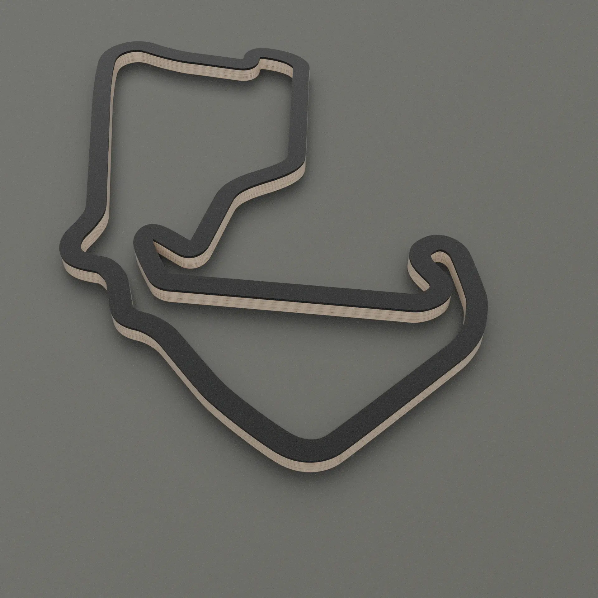Crafted from high-quality multiplex birch wood, the piece reveals subtle layers and edges that add depth without visual noise. A matte black acrylic glass layer floats above the wood, creating a refined contrast and emphasizing the track’s silhouette with quiet confidence. The result is a sculpture that doesn’t shout motorsport — it embodies it. Minimal, balanced, and powerful.